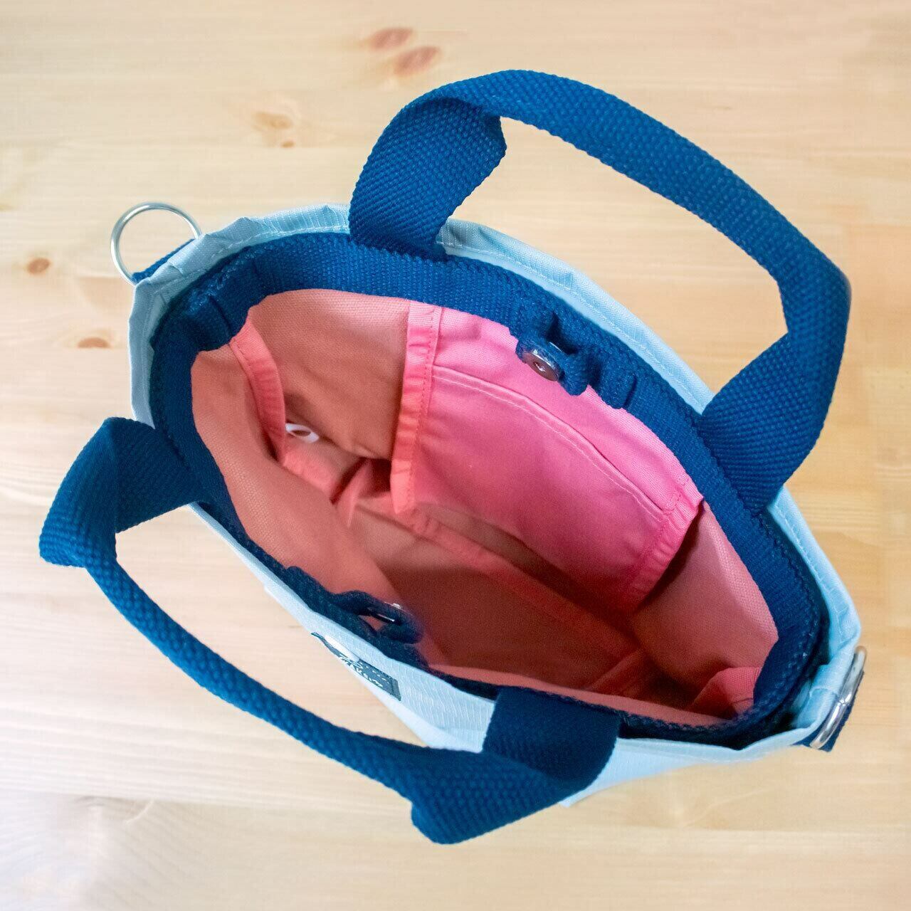 コンパクトにお出かけしたい時にぴったりなミニサイズ。お財布やスマホと小さめポーチを持ち歩けるサイズ感。外側のエコバッグはコンビニなどでの、ちょっとしたお買い物にちょうど良いサイズです。